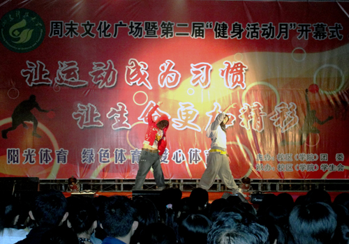 人头攒动、礼花飞扬的广场上,同学们精神抖擞,期待并见证着健身活动月的开幕。开幕式上,裁判员代表和运动员代表进行了比赛宣誓,校区(学院)团委甄惠老师发表致辞,他号召全院师生积极参与体育运动,全面提高身体素质;要求裁判员维护公正的体育裁决,营造良好的竞技氛围。随着甄惠老师宣布健身活动月正式开幕,以“阳光体育,绽放激情”为主题的第二届“健身活动月”启动仪式暨周末文化广场立时启动,迅速点燃了同学们的运动热情。动感十足的啦啦操、潇洒有型的PS街舞、绚丽精彩的轮滑、优美动人的舞姿……现场气氛不断的推向高潮,运动的激情传递到每位同学的心中。