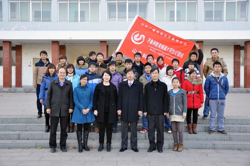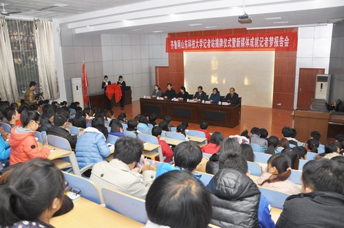 11月27日,齐鲁网教育频道山东科技大学记者站揭牌仪式暨新媒体成就记者梦想报告会在西校园模拟法庭举行。齐鲁网教育频道主编董燕,记者韩仲敏、朱夏雅南,校纪委副书记兼校区(学院)党委常务副书记刘传玺,校区(学院)党政办公室、团委有关负责人,各系负责宣传工作的老师,记者站全体成员及各系从事宣传工作的学生参加了本次揭牌仪式。
