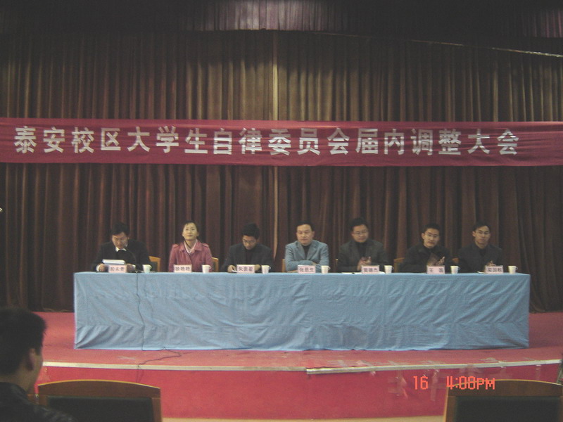 本次调整在学团工作部的指导下及各系基层团组织的协助下,经过层层选拔与严格的考核,本着“公平、公正”的原则,择优录取。会上,黄德杰首先宣布了《泰安校区2006-2007年度大学生自律委员会全体成员名单》。之后,05-06学年度大学生自律委员会主任王磊与本届自律会主任梁国栋分别作了发言。王磊主要从机构调整、各项制度的补充与完善等四个方面总结了自律会过去一年中举办的大型活动及各项工作,向新一届自律会成员们介绍了自己在工作中总结的宝贵经验,并希望自律会在新一届的成员的带领下开创出更加美好的征程。梁国栋代表新一届的自律会全体成员对今后的工作做了设想并表了决心,表示将认真做好基础工作、课外活动与校园文化生活等方面的工作,珍惜和把握好老师及同学们提供的机会,恪守“严谨、求是、务实、创新”,携手同行、奋力拼搏,为同学服务、为泰安校区自律会的发展尽己所能,使自律会绽放出更加夺目的光芒。