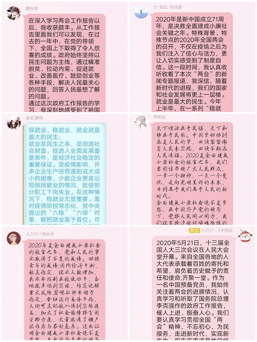 按照活动要求,党支部成员首先通过网络、电视、广播等多种渠道,收听、收看、了解两会现场实况,学习两会精神,热议两会。其次主要围绕“保就业、稳就业,就业就是最大的民生”、“经济基本面持续向好,对未来充满信心”、“坚定理想信念,弘扬爱国热情,增强“四个自信”、“立足本职,加强学习,努力提升自身综合素质”等四个主题展开讨论,党员通过网络交流平台或学习记录的形式积极发表自己的心得和看法,其中,来自人力资源管理专业的预备党员谢洪玉表示,两会召开为我们青年就业择业打了一针强心剂,作为新时代的青年,我们更要坚定理想信念,厚植爱国情怀,增强“四个自信”,不辱使命担当,不辜负党的厚望。