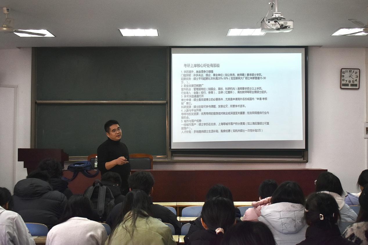 为深入贯彻落实立德树人根本任务,帮助学生科学规划学业发展路径,提升升学竞争力,11月25日,财经学院举办升学规划指导讲座,特邀资深讲师梁武昌担任主讲,学院各年级意向学生参加讲座。