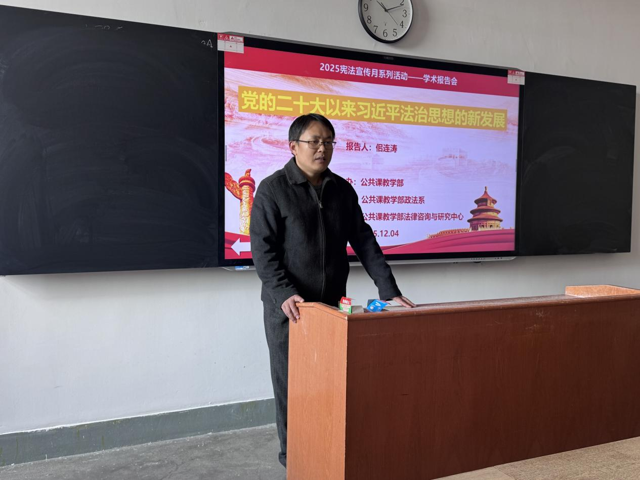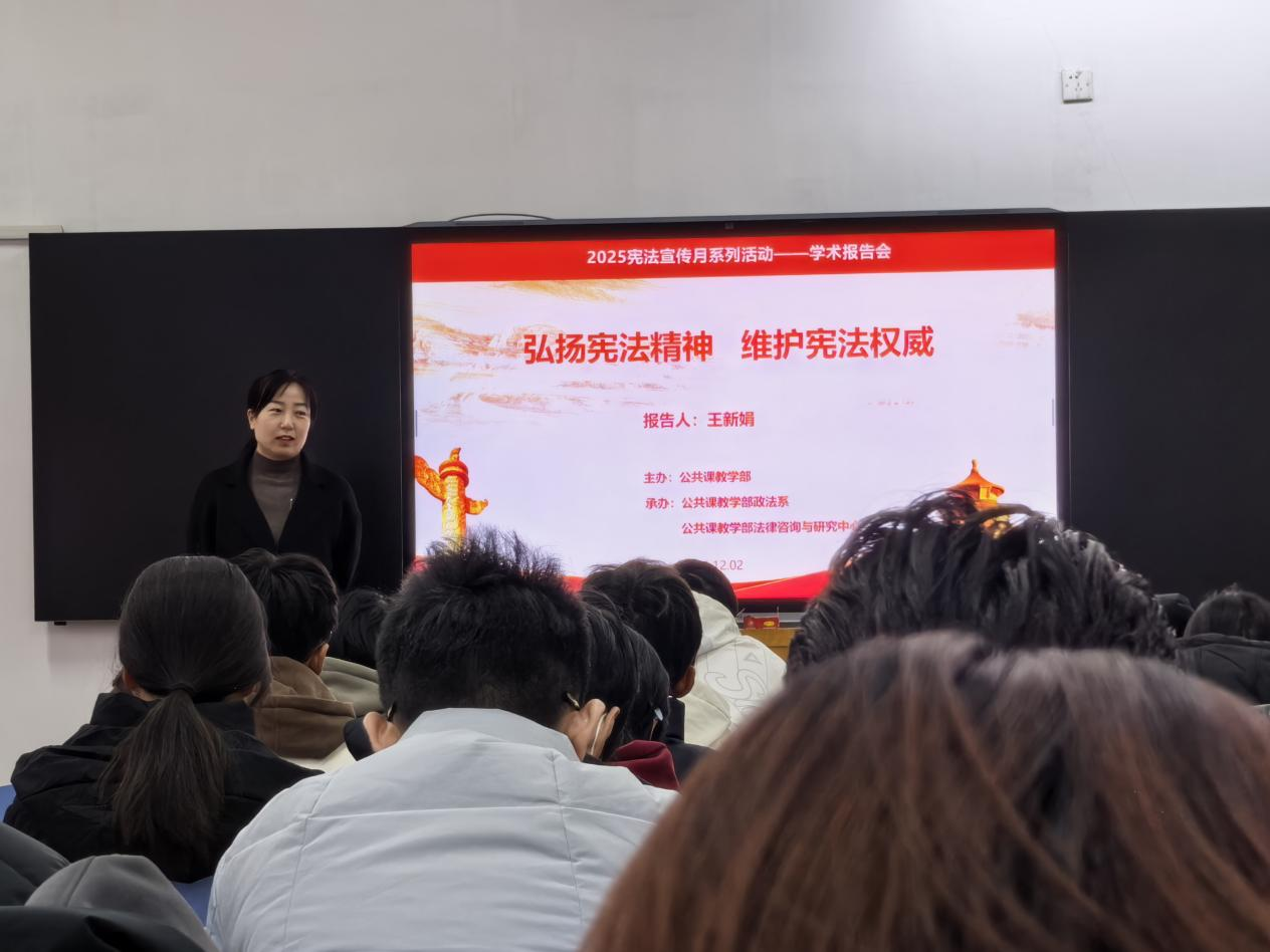 在第十二个“国家宪法日”到来之际,公共课教学部积极响应号召,于12月初组织开展了以“学习宣传贯彻习近平法治思想,推动宪法深入人心”为主题的宪法宣传月系列活动。活动通过学术报告会、宪法知识竞赛等多种形式,在校园内营造了尊崇宪法、学习宪法、遵守宪法、维护宪法、运用宪法的浓厚氛围。