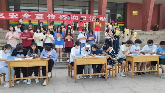 本次活动共分为四个环节:安全知识竞赛、发放安全知识宣传单、消防防护服穿衣技能比赛以及颁奖环节。安全知识竞赛由大学生安全协会成员及学院(部)学生代表自由组队,现场进行问卷答题。安全知识竞赛内容涵盖宗教事务条例、自然灾害预防、实验室安全、交通安全、防溺水、食品安全、疫情防控、消防安全等,涉及范围广、普及性能强,能够有效加强学生对安全生产知识的认识和理解。安全管理部和安全协会工作人员向现场同学发放了安全知识宣传单,进一步普及学生的安全知识。