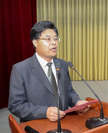 校区、学院党委副书记苏同营代表校区、学院党政向受到表彰的先进集体和先进个人表示热烈的祝贺,向工作在一线的全体学生工作干部表示亲切的问候,向山东金天牛矿山机械有限公司、山东润兴机械设备有限公司对学校教育事业的支持表示衷心的感谢。苏同营指出,过去的一年,校区、学院学生工作认真贯彻落实全国教育大会精神,贯彻全国全省高校思想政治工作会议精神,围绕“立德树人”这一根本任务,以培养担当民族复兴大任的时代新人为己任,坚持稳中求进工作总基调,牢固树立以学生为中心的思想,勇于创新,扎实工作,不断深化、细化、实化学生教育管理服务各项工作,主动融入学校和校区的发展大局,与学校其他事业一道,阔步前行,各项工作均取得了新的成绩:持续深化“五项教育”,大学生思想政治教育育人实效不断提升;着眼学生主体发展,学生事务科学化规范化管理水平不断提高;以学生为本,实施精准服务,服务学生能力显著增强;着力专业化专家化建设,学生工作干部队伍建设稳步推进。他希望同学们积极践行社会主义核心价值观,做仰望星空、志存高远,有家国情怀的梦想家;希望同学们乐于求知,勤学立业,做脚踏实地、毕力躬行,有创新精神的实干家;希望全体学生工作干部坚守立德树人初心,牢记培养时代新人使命,做有担当精神的领路人。最后,他勉励大家继续秉承“惟真求新”的校训,按照习近平总书记提出的“爱国、励志、求真、力行”的四点希望,不松劲,不停步,再出发,在祖国的万里长空放飞青春梦想,书写人生华章。