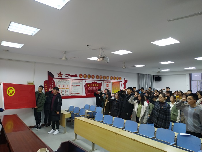 开班仪式上,各位老师为团员代表佩戴团徽,其他团员自行佩戴。随后,由团员代表于超同学带领全体团员重温入团誓词。最后,团员代表扈永琪同学带领全体团员齐唱共青团团歌。
