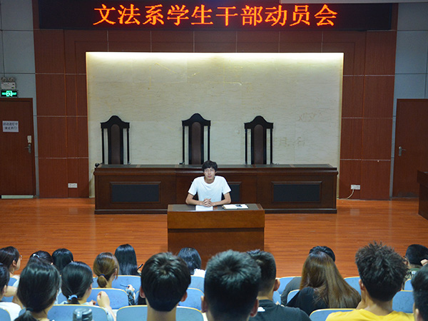 8月25日上午,文法系在模拟法庭召开新学期学生干部动员会。会议由团总支老师刘明远主持,团总支老师张乐、秦泽川,团总支委员,各班班长、团支书,学生兼职辅导员,系第十四届学生会主要学生干部参加会议。