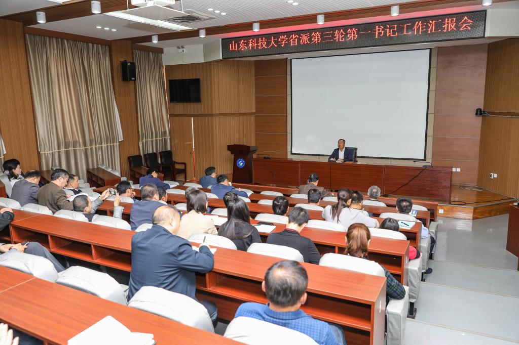 4月23日下午,机关党总支召开山东科技大学省派第三轮第一书记工作汇报会,邀请学校省派挂职郯城县归昌乡朱前村“第一书记”王靖磊做工作汇报,交流驻村扶贫工作第一书记好的经验和做法,弘扬共产党员扎根基层、岗位建功的正能量。机关党总支全体党员参加会议,汇报会由机关党总支书记闫金轩主持。