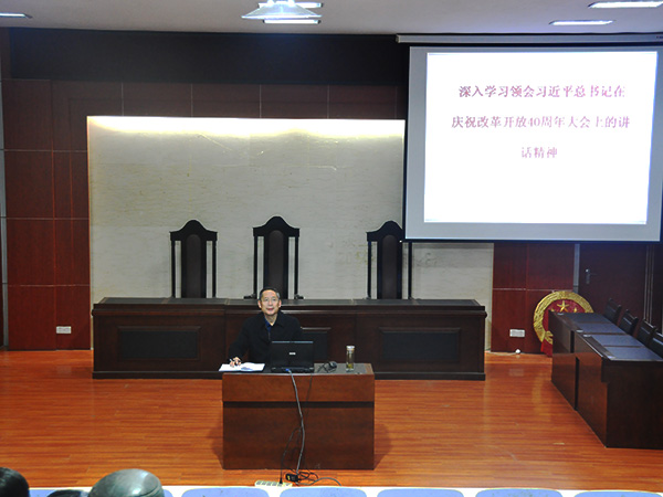 习近平总书记12月18日在庆祝改革开放40周年大会上发表了重要讲话。在前期组织教职工收听收看大会实况的基础上,12月25日文法系在模拟法庭再次组织全体教职工学习领会习近平总书记重要讲话精神。系党总支书记马福泉采用课件讲座的形式,带领大家深入学习讨论。