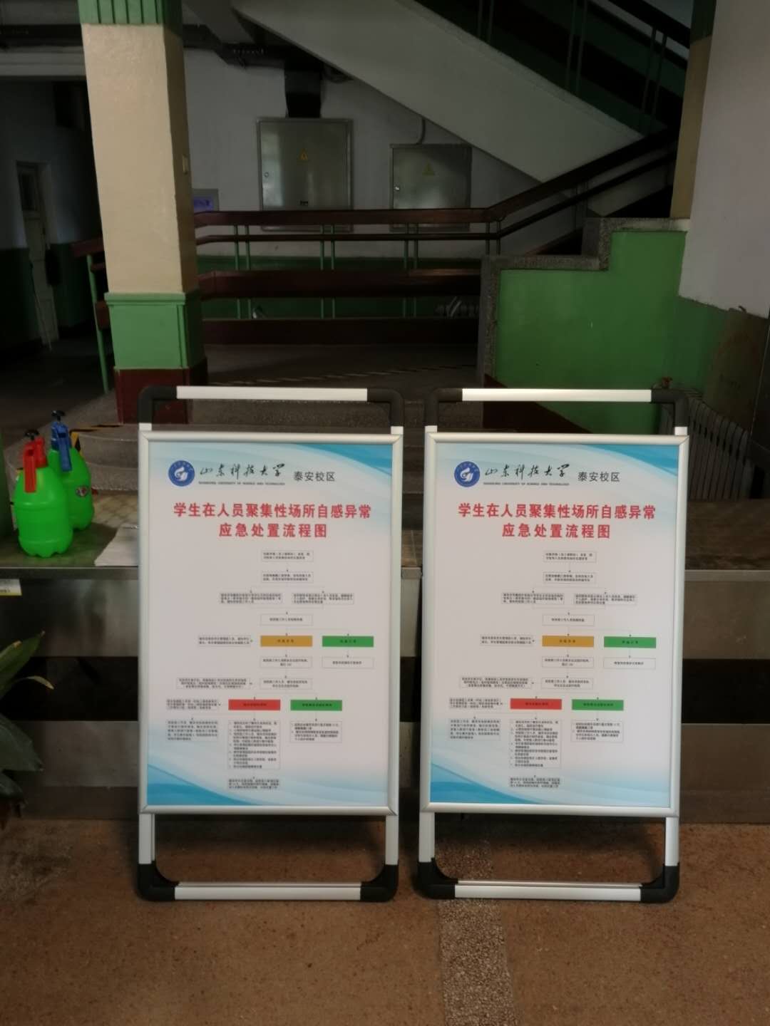 在前期疫情防控措施准备的基础上,图书馆根据《山东科技大学泰安校区新冠肺炎疫情应急处置预案》要求,进一步细化任务清单,夯实责任分工。一是进一步完善图书馆疫情防控工作预案,明确工作流程和责任人;二是在门厅等醒目位置摆放图文并茂的展板与条幅,引导师生员工开展疫情防控,营造浓郁的疫情防控氛围;三是在门厅、楼梯、走廊等部位铺设隔离带,保证人员出入有序,避免人员近距离接触;四是限定入馆人数,保证人员间距不小于两米,调整各阅览室桌椅布局,确保“单人单桌,同向而坐”;五是腾空办公室,建立临时留观点。