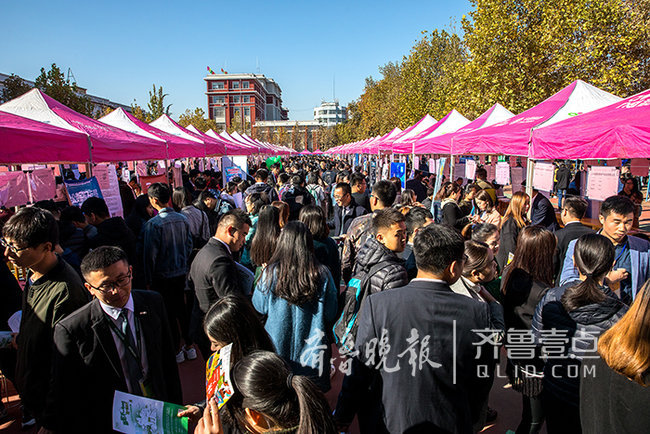 早上8点20分,山东科技大学泰山科技学院2018届应届毕业生袁赞早早来到供需见面会现场。“印象中咱们学校办的招聘会好像没有这么大规模的,以前供需见面会一般在校区排球场举办,这次安排在体育场,所有篮球场全摆满了摊位,跑道上也有非常多摊位,应该是有史以来招聘单位最多的一次了。”袁赞在谈到对此次招聘会的第一印象时说道。正如袁赞所说,本次供需见面会比校区今年4月15日举办的春季供需见面会参会单位足足多了近300家,且提供岗位达23000余个,招聘岗位与校区、学院毕业生人数比例达8.9:1,参会单位不乏中铁、中煤、中交、中国建材、中国化工、山东能源集团、兖矿集团、冀中能源、大屯煤田等央企国企,且参会单位分布广泛,涉及全国14个省、自治区和直辖市及省内全部17个地市,说此次供需见面会是一场“招聘饕餮盛宴”一点也不为过。