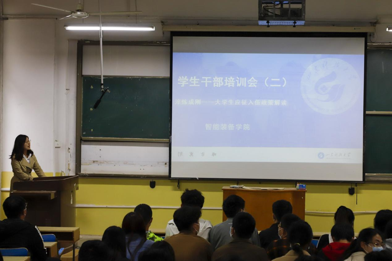 5月10日,智能装备学院于西校园1c102召开学生干部会议(二),智能装备学院辅导员蔡婧婧老师作了题为“淬炼成钢——大学生应征入伍政策解读”的主题报告,2020、2021各班级班长、团支书、心理委员和宣传委员参加。