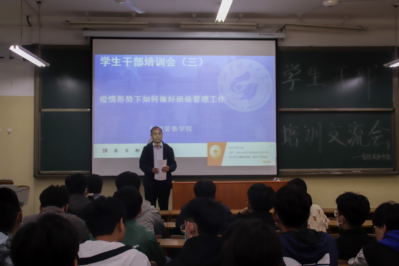 5月20日,智能装备学院于东校园5104召开学生干部培训会,学院学生工作办公室主任、团委书记谢清勇作了题为“疫情形势下如何做好班级管理工作”的主题培训,2018、2019、2020级各班班长、团支部书记参加培训。