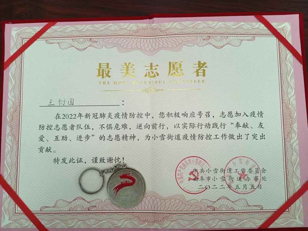 3月31日,曲阜市突发新冠疫情,王衍国闻令而动、主动请缨,就地转为抗疫志愿者,第一时间奔赴战“疫”一线,全力以赴投入了抗疫工作。王衍国主要负责核酸检测现场的秩序维护、防疫宣传及电话核实排查核酸检测人数、敲门入户做好信息统计等工作。“以志愿者的身份,做好党和群众的‘连心桥’,能为隔离区的群众提供力所能及的帮助,为他们排忧解难,我觉得十分有意义。”王衍国曾在接受大众网记者采访时说。