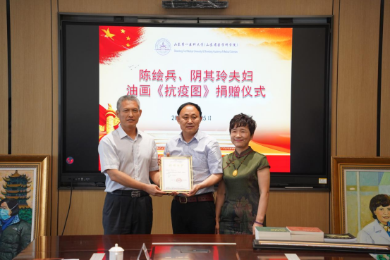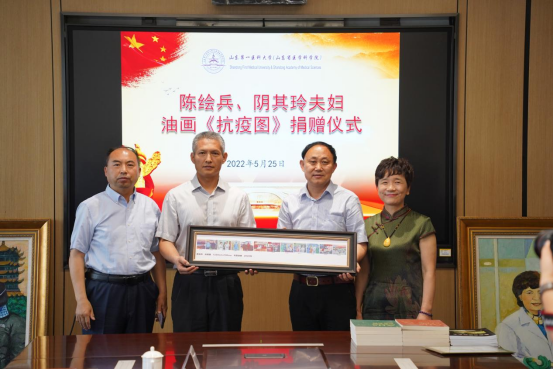 5月25日,校区人文与艺术教育中心主任、公共课教学部教师陈绘兵大型油画系列作品《抗疫图》捐赠仪式在山东第一医科大学(山东省医学科学院)济南主校区举行,公共课教学部主任朱学军出席活动并讲话。