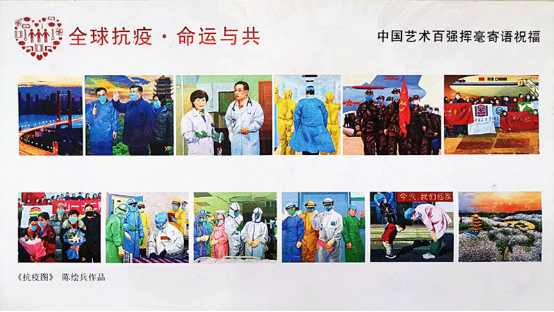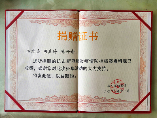 朱学军在讲话中分享了陈绘兵系列油画《抗疫图》的创作历程,高度赞扬了他以艺抗疫的担当和慷慨捐赠的善举,讲述了他们一家三口同心抗疫,不负春天的故事。陈绘兵夫人阴其玲是山东第一医科大学第二附属医院呼吸科护士长,2020年春,她作为山东省第三批援鄂医疗队副队长逆行出征,不顾个人安危,奋战在抗疫一线,为武汉保卫战取得全面胜利作出了积极贡献,她写给儿子的家书《我以母爱爱世人》在《长江日报》连续推出,著名演员蒋雯丽在“为你读诗”节目中深情诵读,在中央广播电视总台文艺之声、阅读之声庆祝中国共产党成立100周年特别节目《追寻——红色家书背后的故事》(第96集)中,著名主持人李思思也诵读了此封家书,在广大听众中引起了强烈共鸣。怀揣对国家安危和家人的牵挂,陈绘兵在后方用心、用情创作了大型抗疫题材油画《抗疫图》,用艺术作品为人们带来精神抚慰,传递昂扬向上的力量,表达对抗疫英雄的深情礼赞和战胜疫情的坚定信念,充分发挥了优秀艺术作品鼓舞人、感染人、激励人的作用,弘扬了伟大抗疫精神。《抗疫图》问世之后,得到了山东电视台、中国集邮文化中心、《中国民族博览》杂志及各网络媒体的高度关注,以多种方式进行了展示推介,产生了较大的社会影响。同时,他们一家还把家书、图片、电视专题片视频等抗疫资料捐献给了山东省档案馆。陈绘兵夫妇二人同心同德,同向而行,共同演绎了一段动人的抗疫佳话。