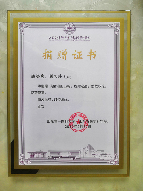山东第一医科大学党委委员、副校(院)长马鲁豫对陈绘兵捐赠油画的义举表示感谢和敬意,并向其颁发了《捐赠证书》。他指出,陈绘兵老师以抗疫为主题,精心创作的12幅油画,用艺术形式栩栩如生记录抗疫画面,弘扬伟大抗疫精神,具有很强的艺术价值和现实意义。此次捐赠活动,对更充分地发挥文化育人作用及山一大校史馆抗疫主题馆布展规划将留下浓墨重彩的一笔。(公共课教学部供稿,捐赠现场图片由山东第一医科大学新闻中心提供)