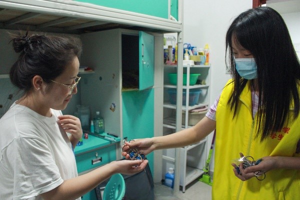 “学姐,毕业快乐,这是您的毕业纪念品”学生会成员走进毕业生宿舍,送上精美的钥匙扣和温暖的祝福。