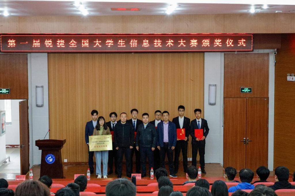 颁奖仪式伊始,谢清勇介绍了首届锐捷全国大学生信息技术大赛的整体赛况,来自全国36个战队共计108名选手参加了决赛阶段的比赛,最终学院两支代表队荣获第一名和第三名的好成绩,并被授予优秀组织院校。学院副院长赵慧奇、锐捷ICT人才教育中心拓展部经理张红涛为获奖学生和优秀指导教师颁发了奖杯和荣誉证书。