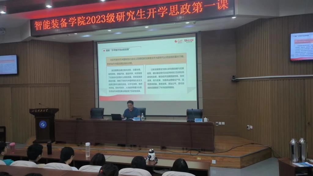 9月7日,智能装备学院党委书记黄德杰以《开辟马克思主义中国化时代化新境界》为题,为2023级全体研究生讲授开学思政第一课。