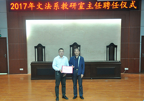 5月2日,文法系在模拟法庭举行2017年文法系教研室主任聘任仪式,系党总支书记马福泉主持,系全体教工参加。