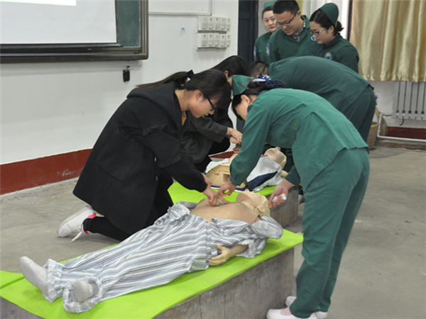 讲座以PPT教学和实践操作相结合的方式展开,从理论和操作两方面对心肺复苏相关知识及技术进行讲解。首先,王靖结合自己的工作实践经验详细讲解如何判断呼吸心跳骤停、人工呼吸及注意事项等内容。六名护士利用电子模拟人轮流演示心肺复苏的过程。随后,现场同学上台在护士指导下操作演练。最后,刘相明讲到:“此次培训让同学们掌握了基本的急救方法和技能,增强了同学们自救互救意识,提升了他们在遇到突发情况时的自我救护和救助他人的技能,有利于将意外事故带来的伤害降到最低限度。”(文:朱晓彤 葛庆盼 图:曲开明 朱芳敏 编辑:杨帆)
