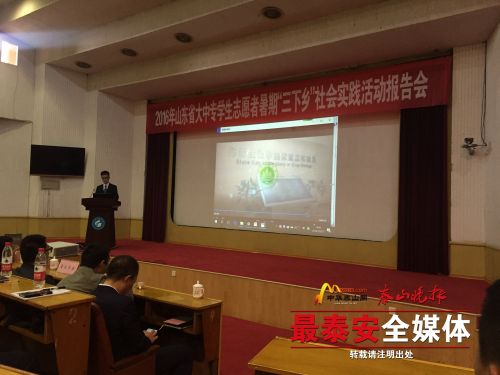 17日下午,2016年山东省大中专学生志愿者暑期“三下乡”社会实践活动报告会在山东科技大学召开,来自泰城各大高校的12支团队对暑期“三下乡”实践活动进行了成果展示。报告会上,大学生们将自己的专业知识运用于“三下乡”的实践中,进行实地调研或是乡村支教,为当地尽自己的一份力量。