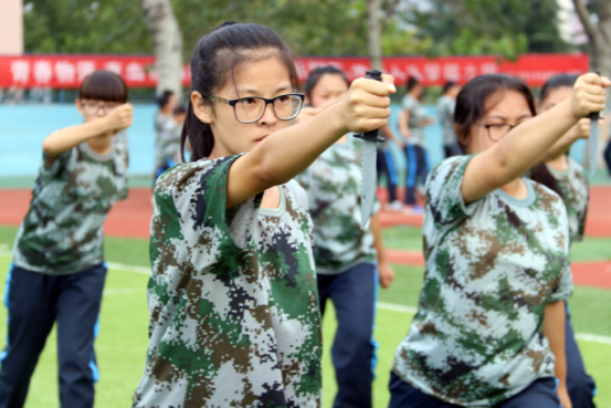别看女生平时娇弱,练起匕首操来可是有模有样,颇有一番巾帼英雄的风范。