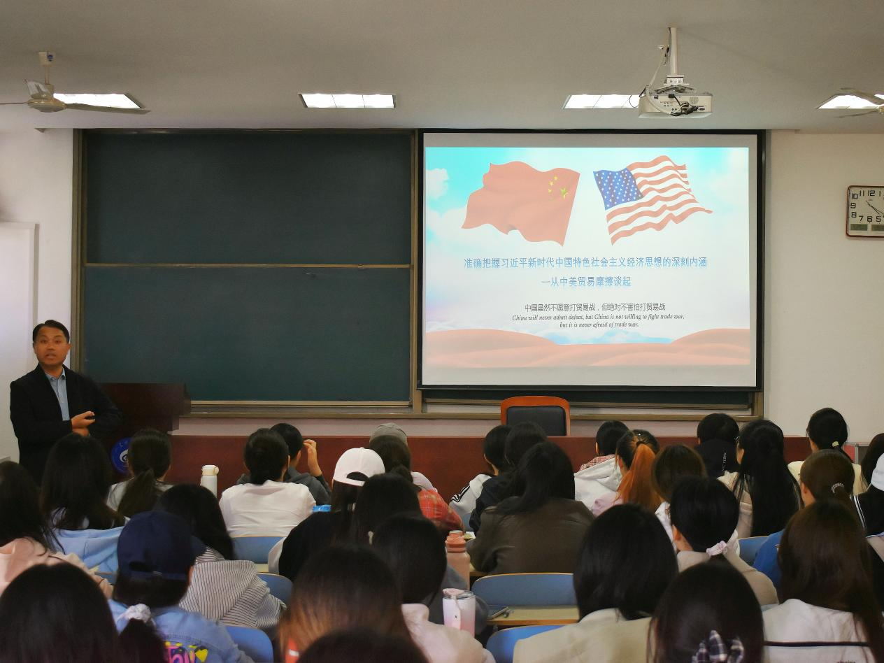 课上,刘庆志紧扣主题,以中美贸易摩擦的演进脉络为切入点,从当前全球经济格局变革、贸易摩擦的新特征与深层逻辑、中国经济发展的战略定力等维度,特别结合党的二十大关于“加快构建新发展格局,着力推动高质量发展”的战略部署,系统阐释了习近平新时代中国特色社会主义经济思想的时代价值与实践路径。刘庆志还结合青年成长实际对学员们提出期望:一是将政治理论学习融入日常,在理解国家经济政策中坚定政治立场;二是把专业学习与国家发展需求结合,在学科实践中践行青年责任;三是增强风险意识与创新思维,在复杂环境中锤炼攻坚克难的能力。