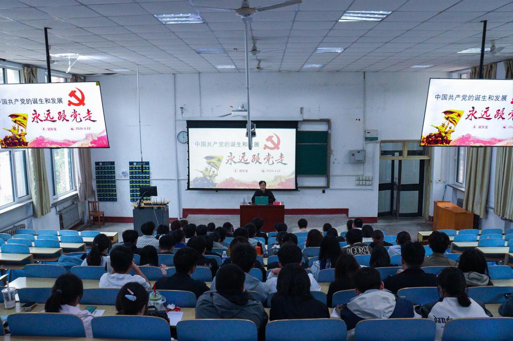 4月22日,资源学院党委书记戴东宝在1A107教室为第44期入党积极分子讲授“中国共产党的诞生与发展,永远跟党走”专题党课。