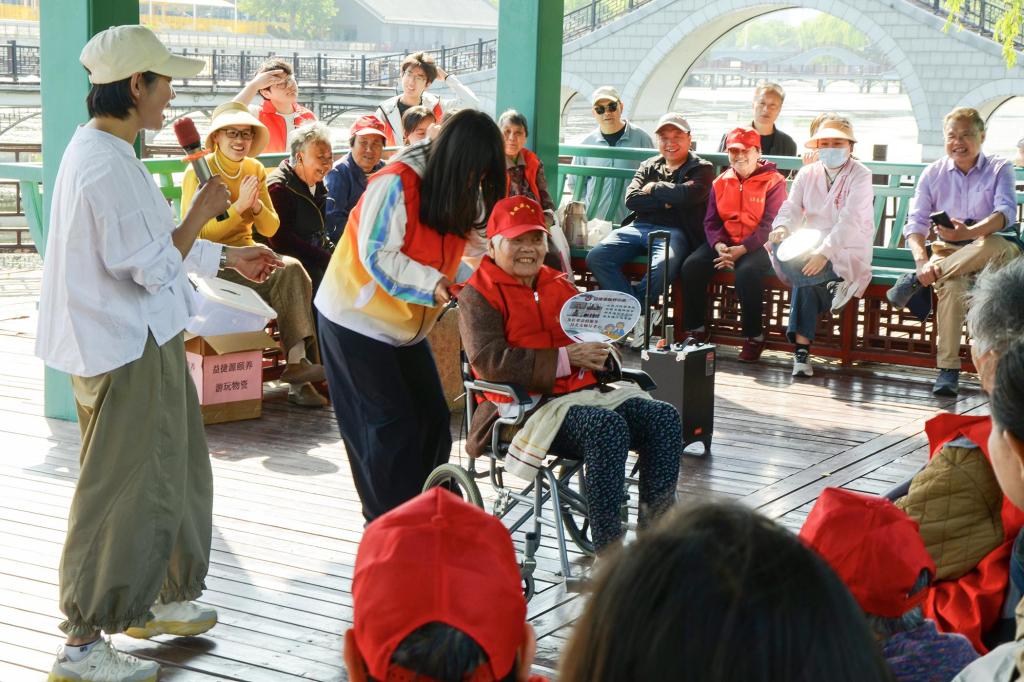 活动当天,志愿者们陪同老人沿平缓路线漫步游园,欣赏自然风光,细心搀扶老人上下台阶,并协助老人拍照留念,用镜头定格他们灿烂的笑容,让长者们真正走出房间、亲近自然。在随后的互动环节中,志愿者带领老人们重温《我和我的祖国》《茉莉花》等经典老歌,老人们纷纷轻声跟唱、拍手应和。活动尾声,志愿者们还组织老人一起参与击鼓传花趣味游戏,花球在老人手中依次传递,笑声不断,现场氛围温馨而热烈。