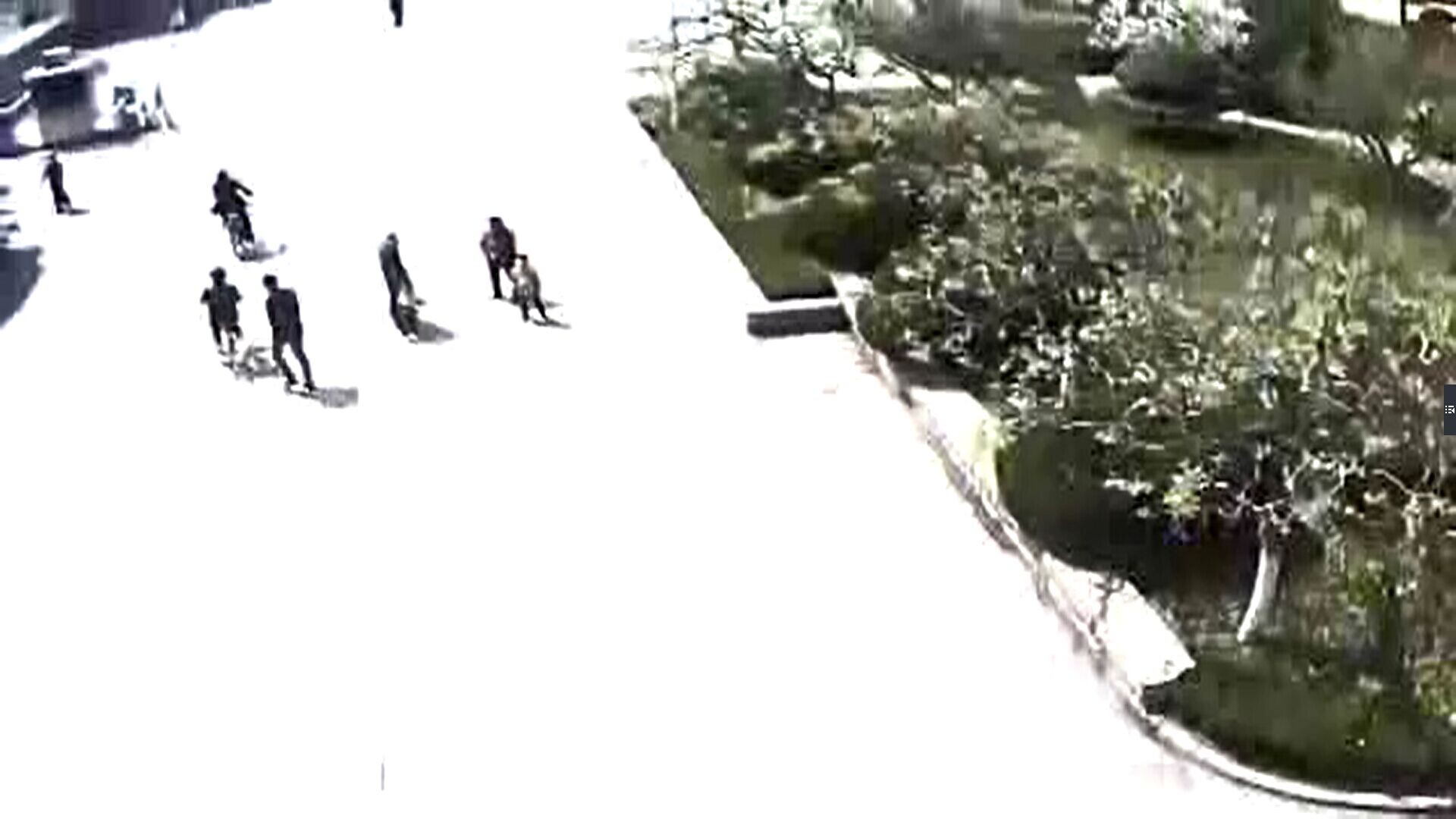 春意阑珊的校园一角,陆陆续续的行人,是四轴飞行器在高空拍摄时掠影的截图。 (文:常立秀 图:高铭辰)