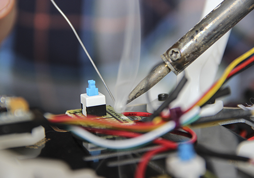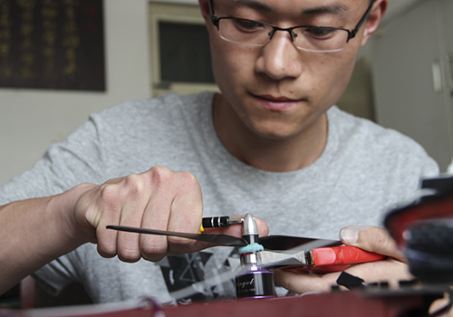 制作航拍器需要焊接电调、电机、跳线、摄像头、图传设备等众多零件,有的很精密。用烙铁焊接过程中必须掌握好温度,随着烙铁氧化程度的增加也要随时调整温度。精力必须高度集中,要专心、细心、耐心,手一抖就会前功尽弃。制作人仅在焊接AV转wifi模块的过程中就耗费了一天时间。期间指导老师魏光村耐心指导,在数据传输和如何用单片机对四轴飞行器进行控制等方面他讲到:“一些原理是共通的,一定要善于学习、善于借鉴,勤翻阅、浏览相关论文和论坛,搜寻有效信息,为己所用。”