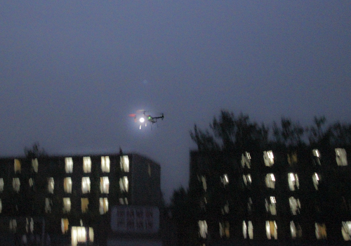 首次试飞时,传输到手机上的画面能清晰的分辨出建筑物。可飞行器在空中“航行”了3、4分钟,达到10多米的空中后,逐渐失控,慢慢下降,加油门后上升了一段距离,可持续不长时间,加速坠落到地面。旋翼、机架、电机等外围零件都摔碎了,现场一片狼藉。