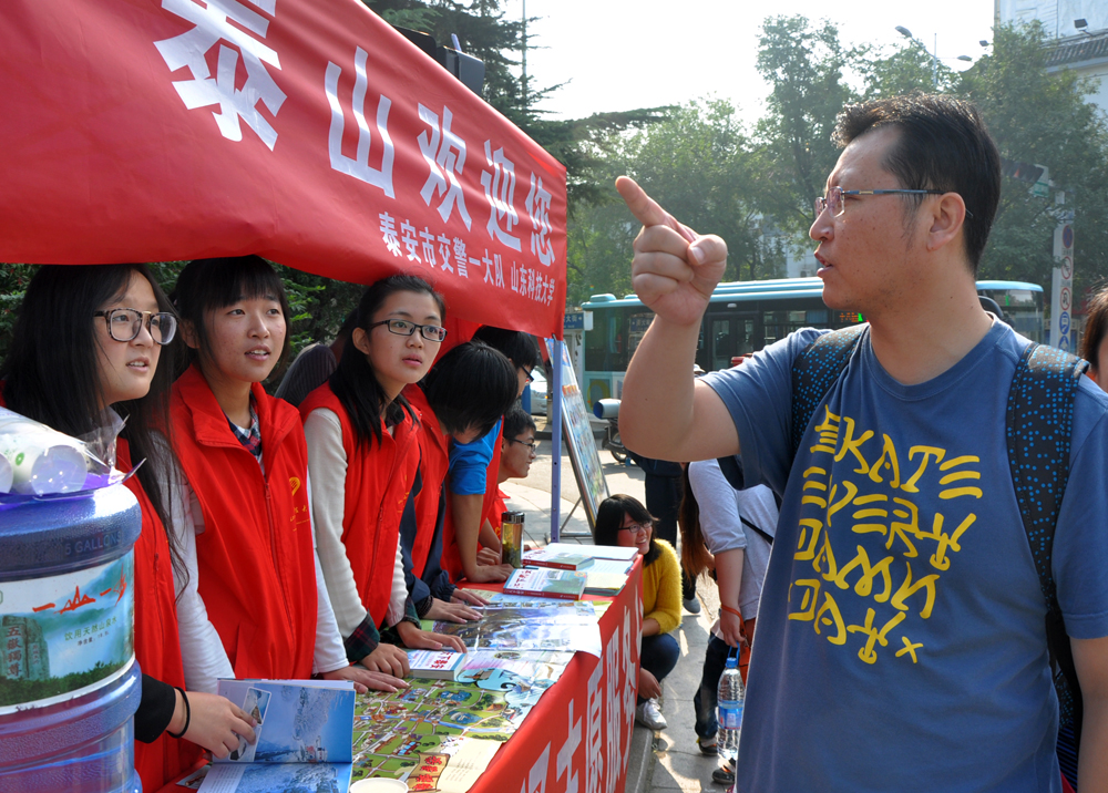 上午8时许,记者在岱东坊附近的十字路口看到,10余名穿有青年志愿者马甲的学生正在路口执勤,他们向游客发放交通安全宣传单,并认真为游客解答他们的疑问。