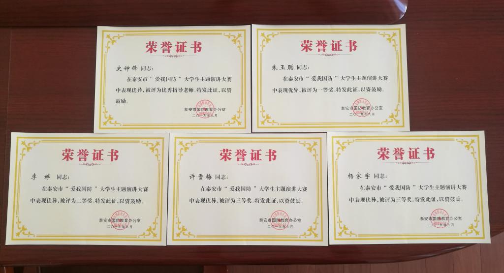 9月下旬,泰安市第三届“爱我国防”大学生主题演讲大赛圆满结束,校区在本次比赛中荣获佳绩。其中,校区荣获泰安市组织领导奖,文法系法学17-2朱玉聪、社工18-1李婷分别获得一、二等奖,信息系电科18-1许雪梅、计科18-2杨家宇获得三等奖,文法系中文教研室史钟锋老师获得优秀指导老师奖。(文:学生处)