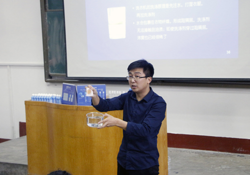 本次活动以“科学洗衣”为主题。活动伊始,薛庆照围绕“如何科学洗衣,正确选择洗衣液”这一主线向在场观众提出问题,两名同学进行了洗衣比拼,他现场指导并纠正了同学们在比拼过程中出现的错误洗衣方法。接着薛庆照简单介绍了从公元前至今人类洗衣进化史,用实验有力地证明了油水不相溶,并指出油水不相溶是油渍难以洗净的根本原因,同时他为同学们提供了干衣预涂这一科学的洗衣方法,与同学们分享了清洗油烟机的小技巧。活动最后,薛庆照还结合自己的亲身体验介绍了洗衣大师的相关问题。