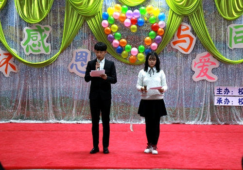 11月24日,由校区、学院团委主办,校区、学院学生会女工部承办的以“心怀感恩,与爱同行”为主题的感恩演讲决赛在东校园大学生活动中心成功举办。