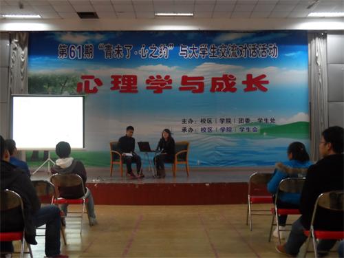 11月15日,由校区(学院)团委、学生处主办,校区(学院)学生会承办的第61期“青未了·心之约”大学生交流对话活动在东校园举行,本期以“心理学与成长”为主题,邀请黄岛校区心理学专业讲师侯超老师与同学们进行交流对话。