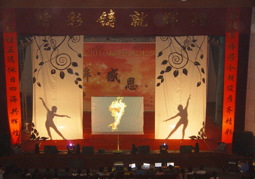 看征程正远,他日四海共辉煌;喜桃李芬芳,今朝俊彦齐精彩。6月22日,由校区(学院)学生处、团委、工会主办,校区(学院)学生会、大学生艺术团承办的2010届毕业生文艺晚会在西校园礼堂华丽开幕。晚会现场,校区(学院)及各部门、各系领导、老师与毕业生齐聚一堂,回眸昨日,感恩你我,展望未来。