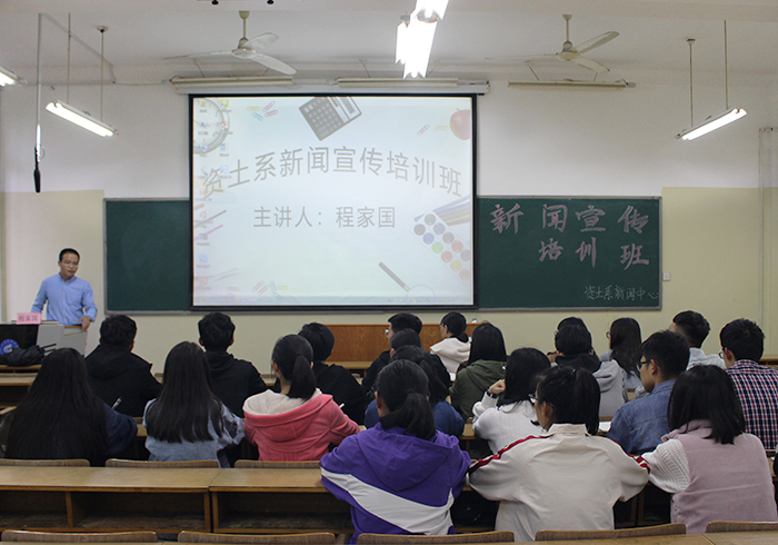 10月25日,资土系新闻中心在5#305举办新闻宣传培训班第二课,系团总支书记程家国担任主讲,新闻中心全体成员参加。