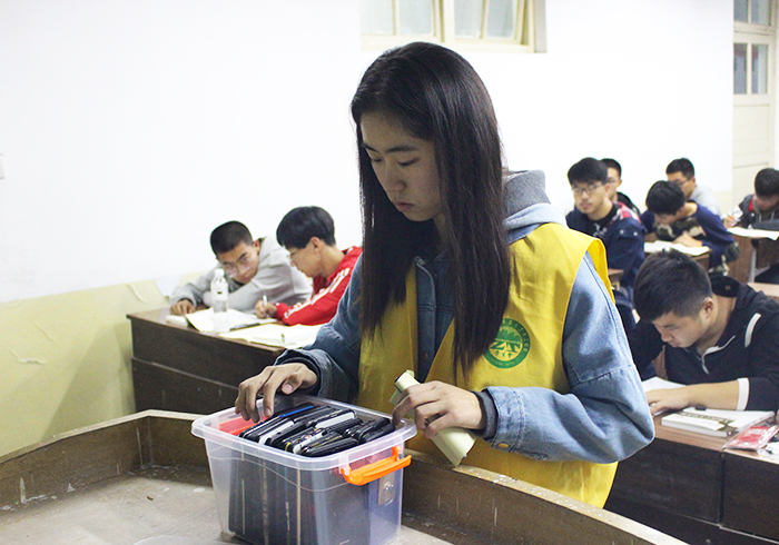为加强学风建设工作,在新生班级中营造良好的学习氛围,资土系在各新生班级继续开展“人机分离”活动。在活动中,自律会成员通过进入班级,检查“手机休息箱”中的手机数量并与班级人数比对,监督大家上课及晚自习期间专心学习,不做“低头族”。(文:赵甜星 图:胡逸文)