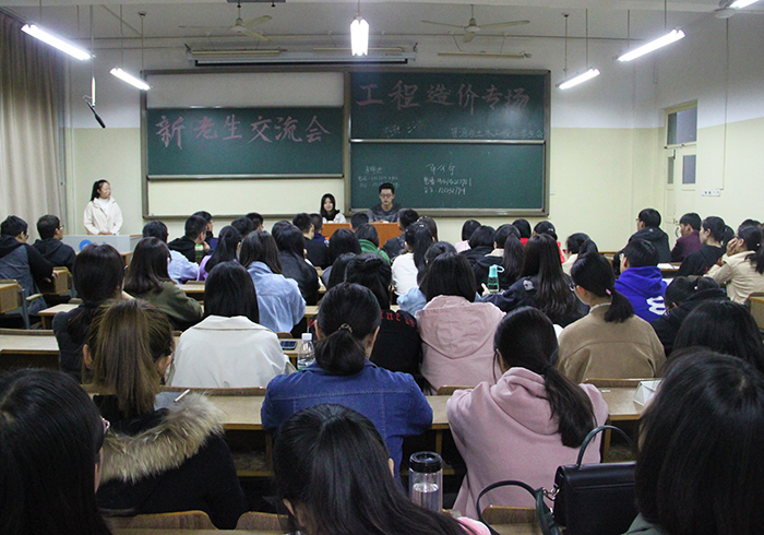 10月11日,资土系在5#404举行工程造价专业新老生交流会,大三优秀学生代表邵传宇、朱锦迪同18级新生进行交流。
