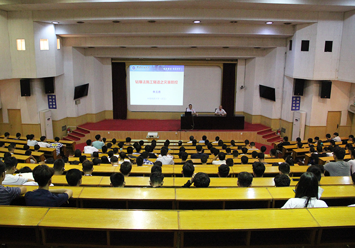 会上,焦玉勇就钻爆法施工隧道之灾害防控的前景、机理、预防、处置、建议五方面进行详细介绍,他指出在山岭隧道施工中,地层中发育大量的含水、导水构造并赋存岩溶水体,当被隧道开挖扰动或揭穿隔水结构,常常会诱发突泥、涌水、塌方等恶性施工灾害的出现,而这些灾害的发生基本上是开挖扰动、爆破震动、应力重分布、地下水排泄造成的。随后,为使同学们能准确了解灾害的严重性,他向同学们列举了宜万铁路野三关隧道、宜万铁路马鹿箐隧道、沪蓉西公路龙潭隧道等发生塌方、涌泥事故的事例。为了避免这些事故的发生,有效的解决方案就是提前预防,其有效预防手段包括地质超前预报、风险评估、信息化监控、设计变更等方法。最后,他结合自己的学习生涯和工作经历,告诫同学们要保持在山东科技大学养成的良好习惯,重视每一次实习的机会。虽然专业工作条件艰苦,但发展前景是非常乐观的,希望每一位同学都能确认自己的目标,不断学习,不断进取。