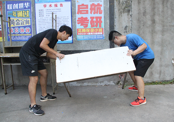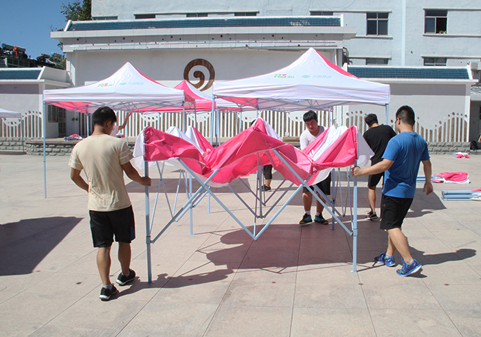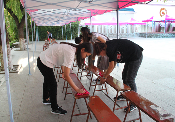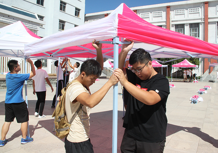 5、撑起帐篷,为明天新生报到提供便利。 6、加固支撑点,保证将其撑得稳稳当当。 7、拿起湿布,把桌凳擦得干干净净。