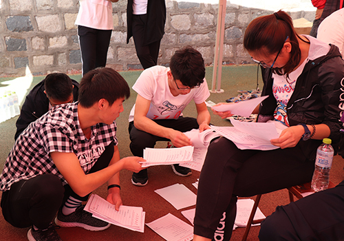 4月19日上午,在运动会赛场的一个角落,资土系学生会新闻中心的工作人员紧张的进行挑选加油稿件的工作。