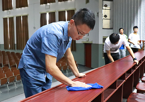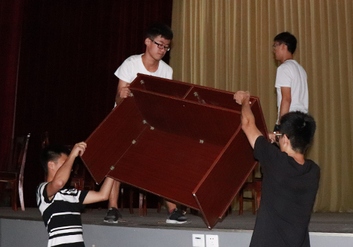 学生会各部门进行合理分工,紧密配合,将准备工作高质量完成。有的部门在礼堂擦拭座椅,确保桌凳的干净整洁;有的部门负责到教学楼搬运桌椅,做好会场布置;有的部门负责铺设主席台台布、放置台签,保证明天大会顺利开展;有的部门进行会标的准备,表达对17级新生的热切欢迎。准备现场忙而不乱,紧张有序,每个人都忙碌起来,积极为迎新大会做准备。(文:李晓禾 图:刘晓凤 彭衍嵩)