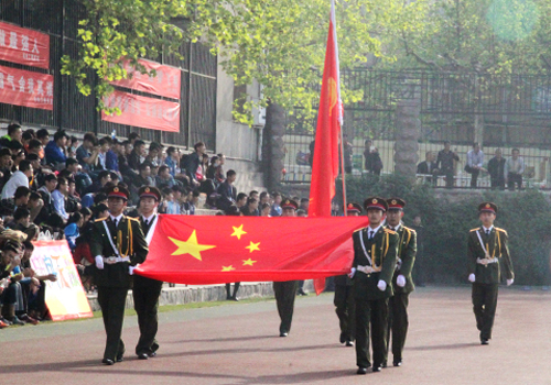 图(1):仪仗队高举国旗、校旗隆重进场,代表国家神圣尊严。