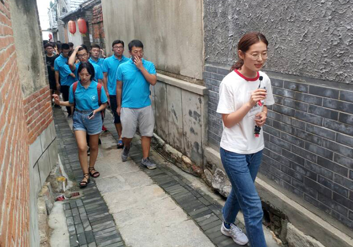 工作人员带领成员参观九曲巷,工作人员介绍:青岛平度市古岘镇将特色小镇建设与美丽乡村建设相结合,重点打造了二里村百年九曲巷。同时投资建设康城公园,实施镇驻地风貌整治,展现别样的风采。该镇采用了倒三角的发展模式,优先发展第三产业来带动第一产业和第二产业的发展,从而带动整个地区的稳定可持续发展。