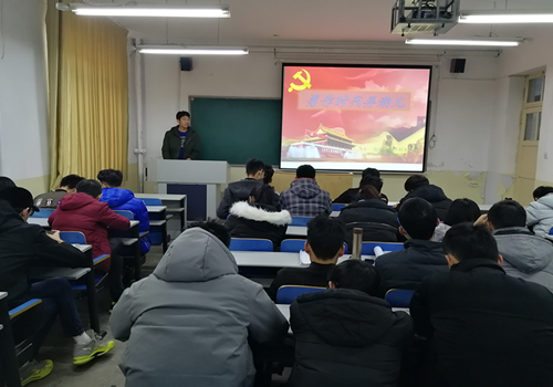 团支书张显通过纪录片《辉煌中国》向同学们展示了中国经济社会发展所取得的成就,与同学们讨论了十九大报告会上习近平总书记阐述的新时代坚持和发展中国特色社会主义的基本方略,并交流了自己学习十九后的收获。会上,他以十九大会议主题激励同学们,希望同学们能贯彻落实党的十九大精神,高举社会主义伟大旗帜,为实现中华民族伟大复兴尽自己的一份力。