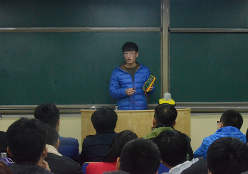 培训会上,电子爱好者协会的成员们为科联全体成员讲解了众多专业工具的使用流程及注意事项,包括电烙铁、焊锡丝、海绵纸、胶枪、万用表等。他们结合理论知识对各种工具进行实际操作,演示了工具的具体使用步骤,操作过程中对各注意事项加以强调,并与科联成员交流互动,科联成员积极参与互动,上台实际体会操作流程。他们还就某些操作问题展开进一步讨论,并实际操作验证了各自的想法。(文: 曹浩浩 亓浩东 图: 曹政昊)